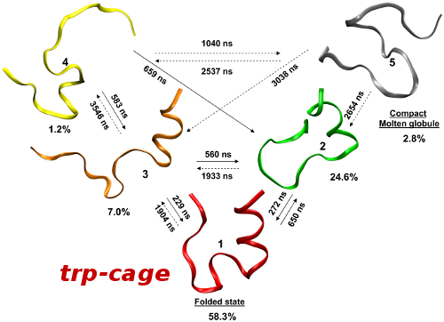 We applied a recently developed a technique, bias-exchange metadynamics, (ref [1]) that allows exploring the high-dimensional free energy landscape of small proteins, for example the trp-cage, villin and insuline. The results of the simulation were then analized with an approach aimed at extracting a kinetic model from bias-exchange simulations (ref [2]). This combined approach allows:
