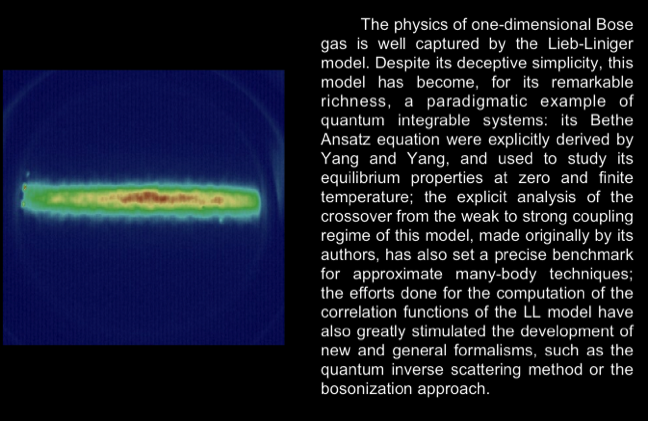 So far, my main interest in the field has been mainly focused on quantum quenches, which can be cleanly studied in such systems, and on the properties of the one-dimensional Bose gases.
