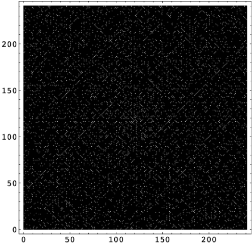 But whatever eccentricities the primes may exhibit “on the small scale”, their aggregate behavior is orderely and predictable. The function which counts the primes becomes more and more smooth on a large scale and can be exactly determined. Fascinating patters emerge as well when the natural numbers are plotted in spiral lattices, where it happens that many primes fall in straight lines: this pattern of straight lines shows that there exists many quadratic polynomial functions which produce large sequences of primes.